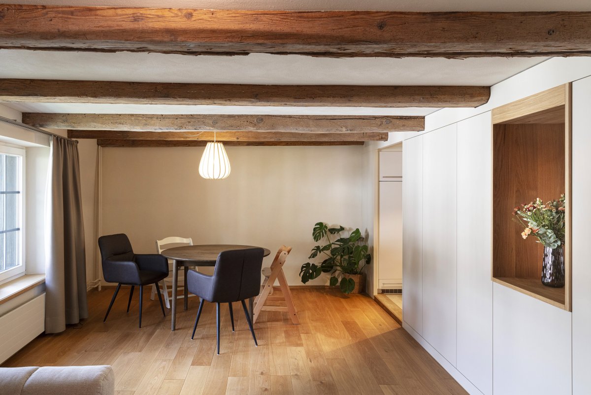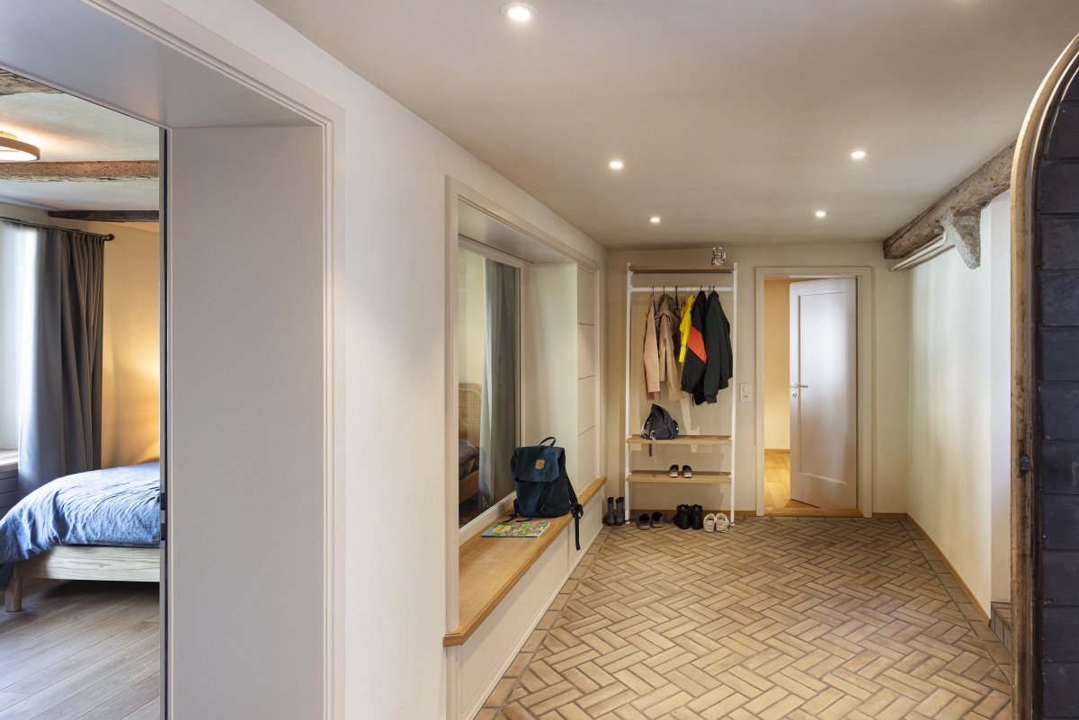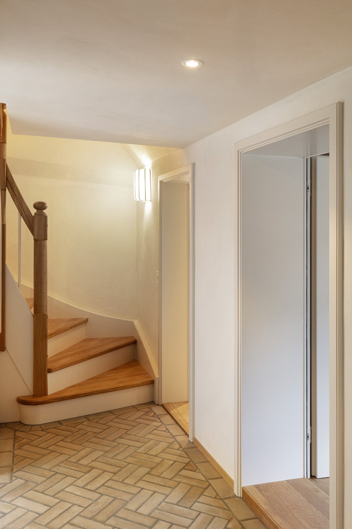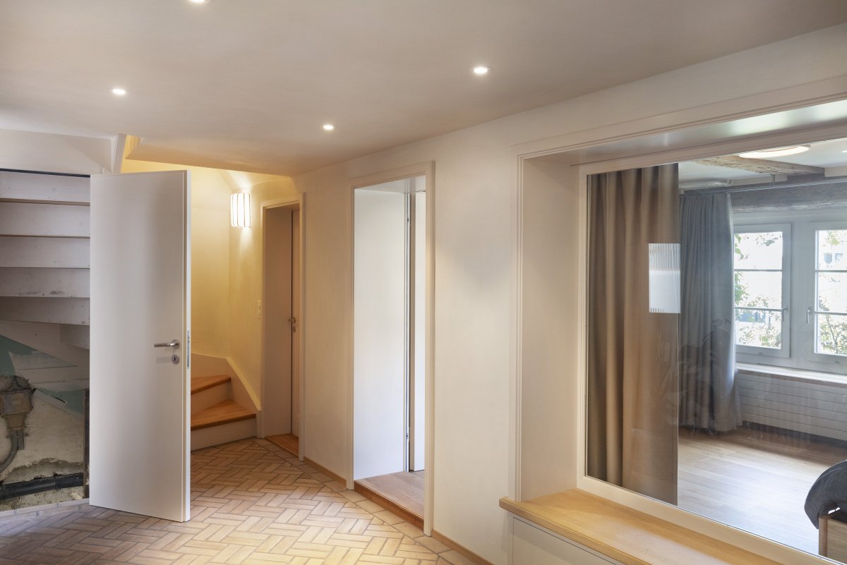Wände und Decken waren über Jahrhunderte Schicht um Schicht überdeckt worden – Anstrich über Anstrich, Täfer auf Täfer, Pavatex, zuletzt ein kunststoffvergüteter Abrieb auf Gipsplatten. Was als sanfte Oberflächensanierung begann, führte schliesslich zum Rückbau sämtlicher Schichten bis auf das rohe Bruchsteinmauerwerk.